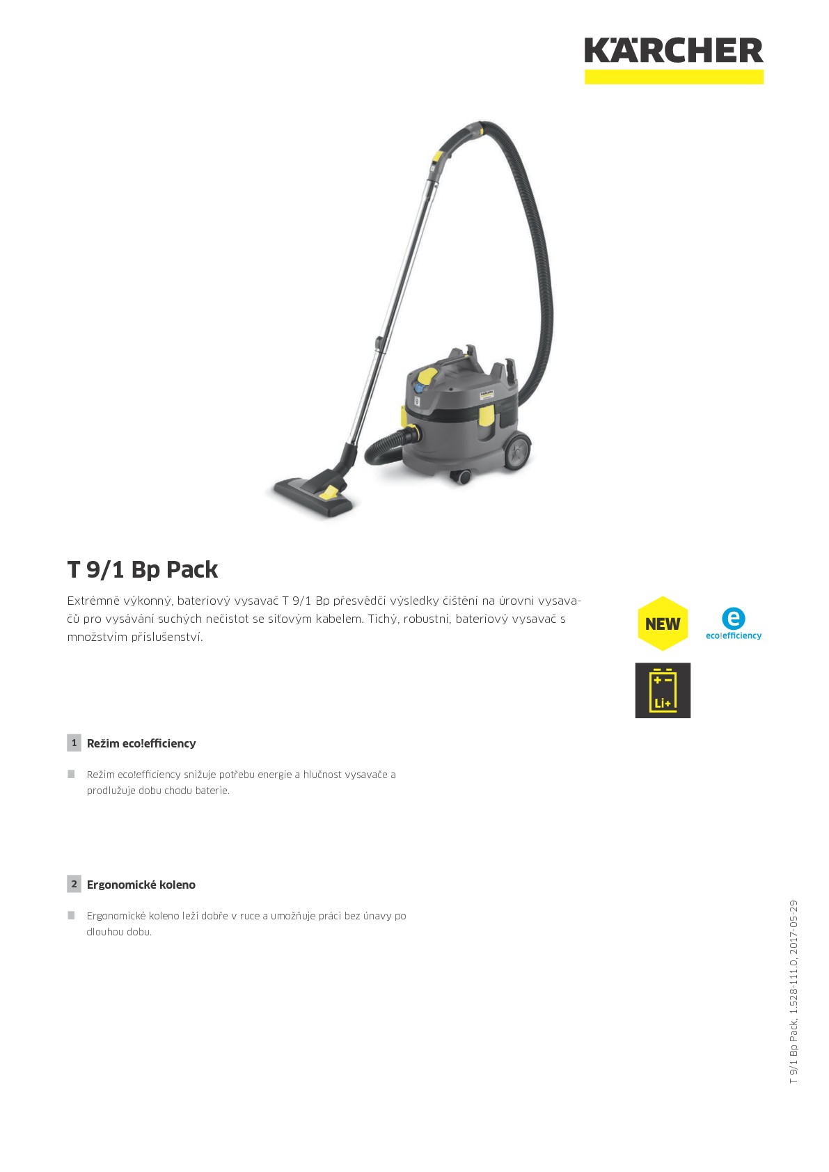 Náš nový bateriový vysavač T 9/1 Bp spojuje bez problémů flexibilnost bateriového vysavače s výkonností a kvalitou čištění vysavače na vysávání suchých nečistot se síťovým kabelem. Vysoce výkonná Li-Ion baterie umožňuje dobu chodu 26 minut (v režimu eco!efficiency 43 minut) - dostatek času pro intenzivní intervaly čištění. V případě potřeby lze baterii kdykoli rychle a jednoduše vyměnit, takže nic nebrání prodloužení pracovních intervalů. Robustní a tichý vysavač je speciálně konstruován podle potřeb hotelů a maloobchodů a lze ho používat i během denního provozu. Kromě toho se bateriový vysavač ideálně hodí i pro čištění budov nebo dopravní podniky - například pro rychlé průběžné čištění vozidel. Sériové příslušenství je samozřejmostí spolu s baterií, rychlonabíječkou a vliesovým sáčkem odolným proti roztržení, který v porovnání s běžnými papírovými sáčky pojme až dvojnásobné množství nečistot.
