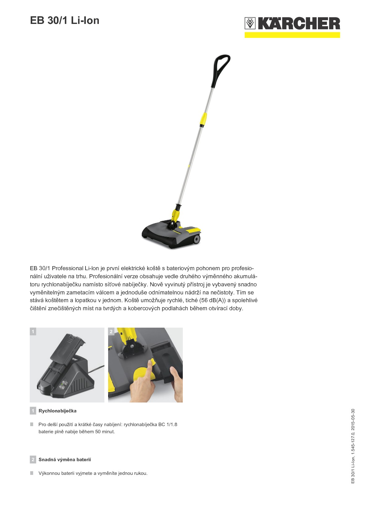 Prostřednictvím druhého výměnného akumulátoru lze zdvojnásobit provozní dobu tohoto přístroje. S rychlonabíječkou v sériovém vybavení se dá nabíjecí doba zkrátit ze 3 hodin na 90 minut. Výměnné akumulátory dovolují pracovat bez přerušení. Koště EB 30/1 Professional Li-lon lze zapnout a vypnout nožním spínačem. Tento plochý přístroj (90 mm) podjede topná tělesa i nábytek, pojme nečistoty až do vzdálenosti 2 mm od okraje. Teleskopická tyč s rukojetí lze přizpůsobit výšce obsluhující osoby a prostřednictvím kardanového kloubu lze s přístrojem pohybovat všemi směry. O pracovních přestávkách zapadne teleskopická tyč do svislé polohy. Vzhledem k tomu, že přístroj pracuje bez kabelu, není téměř potřeba času na přípravu jeho použití. Elektrické koště pracuje na kobercových podlahách okolo 60 minut, na tvrdých podlahách okolo 80 minut, než se výkonný litium-iontový akumulátor vybije a musí se znovu nabít či vyměnit.