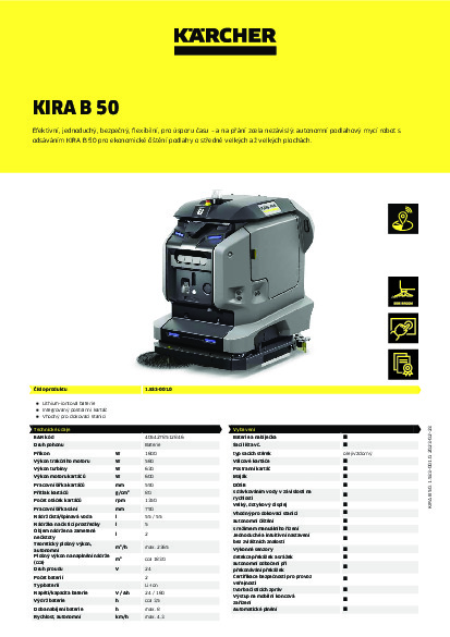 Autonomní robot KIRA B 50 firmy Kärcher je smysluplným doplněním každého týmu. Inteligentní, autonomní a s funkcemi podlahového mycího stroje s odsáváním převezme efektivně a s konstantními výsledky čištění podlah o středně velkých až velkých plochách a podpoří tak úklidový personál, který se díky tomu může věnovat náročnějším úkolům. Intuitivní vedení uživatele pomocí velkého dotykového panelu umožňuje rychlé nastavení bez zvláštních znalostí. Volitelná dokovací stanice zajistí plně autonomní práci, včetně plnění čistou vodou, vyprazdňování špinavé vody, proplachování nádrže a nabíjení lithium-iontové baterie s dlouhou životností. Hlava s válcovým kartáčem se postará o zametání a mytí v jednom pracovním kroku, integrovaný postranní kartáč přitom uspoří manuální čištění podél krajů. Výkonné senzory a software zajišťují spolehlivou navigaci, objíždění překážek a bezpečně zamezí kolizi. Pro dokumentaci a kontrolu odesílá KIRA B 50 hlášení stavu na mobilní koncová zařízení a sestaví detailní zprávy o čištění na příslušném webovém portálu.