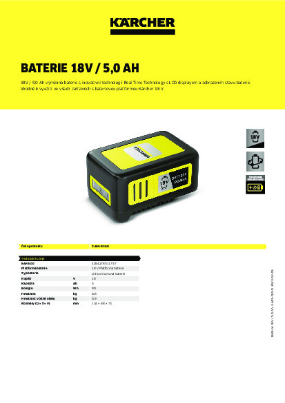 18V / 5,0 Ah výměnná baterie s inovativní technologií Real Time Technology s LCD displayem a zobrazením stavu baterie. Vhodné k využití ve všech zařízeních s bateriovou platformou Kärcher 18 V.