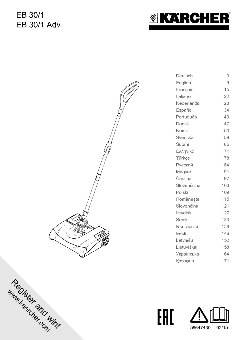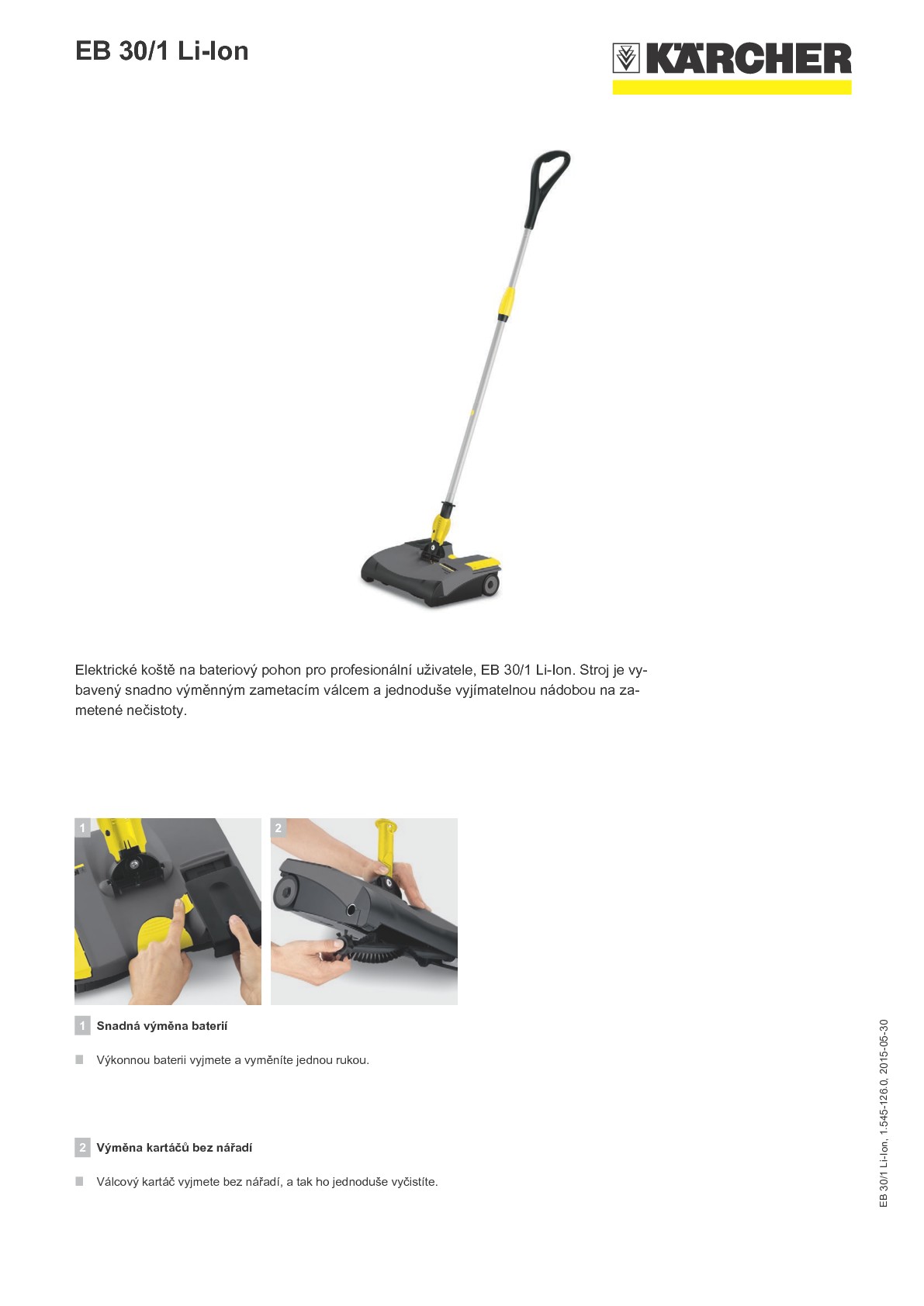 EB 30/1 Li-Ion se zapíná a vypíná nožním pedálem. Ploché koště (90 mm) podjede topná tělesa i nábytek a pojme volné nečistoty i ve vzdálenosti jen 2 mm od kraje. Teleskopickou tyč s rukojetí lze nastavit na výšku postavy obsluhy a pohybovat jí pomocí kardanového kloubu všemi směry. O pracovních přestávkách zapadne do svislé polohy. Jelikož EB 30/1 Li-Ion pracuje bez kabelu, není téměř zapotřebí čas na přípravu. Elektrické koště může pracovat na kobercích okolo 30 minut a na tvrdých podlahách 45 minut, než je třeba opět nabít výkonný niklokadmiový akumulátor. S volitelnou rychlonabíječkou lze dobu nabíjení zkrátit ze 3 hodin na 90 minut. Výměnný akumulátor umožňuje práci zcela bez přerušení.