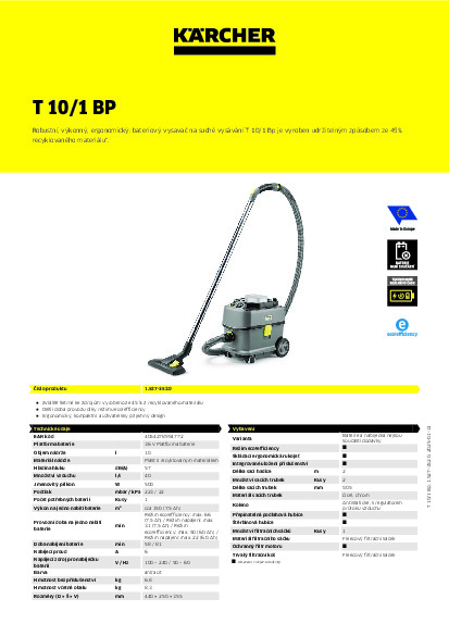 Hotelové a gastro služby, stejně jako maloochodní prodejci a úklidový pracovníci, velmi těží z vynikajícího sacího výkonu a tichého provozního hluku pouhých 57 dB(A) našeho bateriového vysavače na suché vysávání T 10/1 Bp. Vysavač je vyroben udržitelným způsobem ze 45 procent recyklovaného materiálu (všechny plastové díly kromě příslušenství) a zaujme vynikající kvalitou čištění, robustností a prvotřídním poměrem ceny a výkonu. Díky výkonným 36 V bateriím Kärcher Battery Power+ dosahuje vysavač vynikajících výsledků čištění. T 10/1 Bp je kompaktní, odolný proti převrácení a snadno ovladatelný s kapacitou 10 litrů. Skládací rukojeť umožňuje ergonomickou přepravu blízko u těla. Díky integrovanému úložnému prostoru pro příslušenství lze dodávanou štěrbinovou hubici vždy uložit na hlavě stroje T 10/1 Bp, tedy na dosah ruky. Volitelně lze zakoupit vysoce účinný filtr HEPA 14. Při objednávání mějte na paměti, že pro tuto verzi stroje je nutné baterii a kompatibilní rychlonabíječku objednat samostatně.