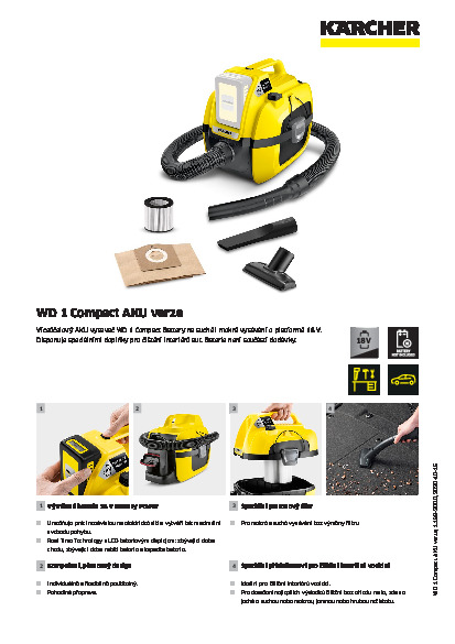 Díky provozu na baterii poskytuje AKU víceúčelový vysavač WD 1 Compact Battery maximální volnost pohybu. Lze jej použít bez připojení k síti a je také extrémně lehký a kompaktní. V závislosti na použité baterii 18 V (baterie není součástí dodávky) může víceúčelový vysavač běžet 10 až 20 minut. Kompaktní AKU vysavač disponuje robustní plastovou nádobu o objemu 7 l a filtrem na kartuše pro pohodlné vysávání suchých a mokrých nečistot bez nutnosti výměny filtru. Další vlastnosti vybavení: sací hadice optimalizovaná na průtok a speciální příslušenství, jako jsou štěrbinové a čalouněné trysky, výrazně přispívají k optimálnímu zachycování nečistot a zajišťují dokonalou čistotu – v neposlední řadě i při čištění interiérů vozidel. Dalším praktickým detailem je pružná gumová páska, kterou lze použít k dokonalému upevnění sací hadice. Kompaktní průmyslový vysavač WD 1 usnadňuje čištění díky dalším funkcím, jako je funkce dmychadla, zamykací systém Pull & Push, ergonomická rukojeť a řešení úložného příslušenství. A díky kompatibilitě lze baterii 18 V použít i pro další techniku Kärcher o stejné platformě.