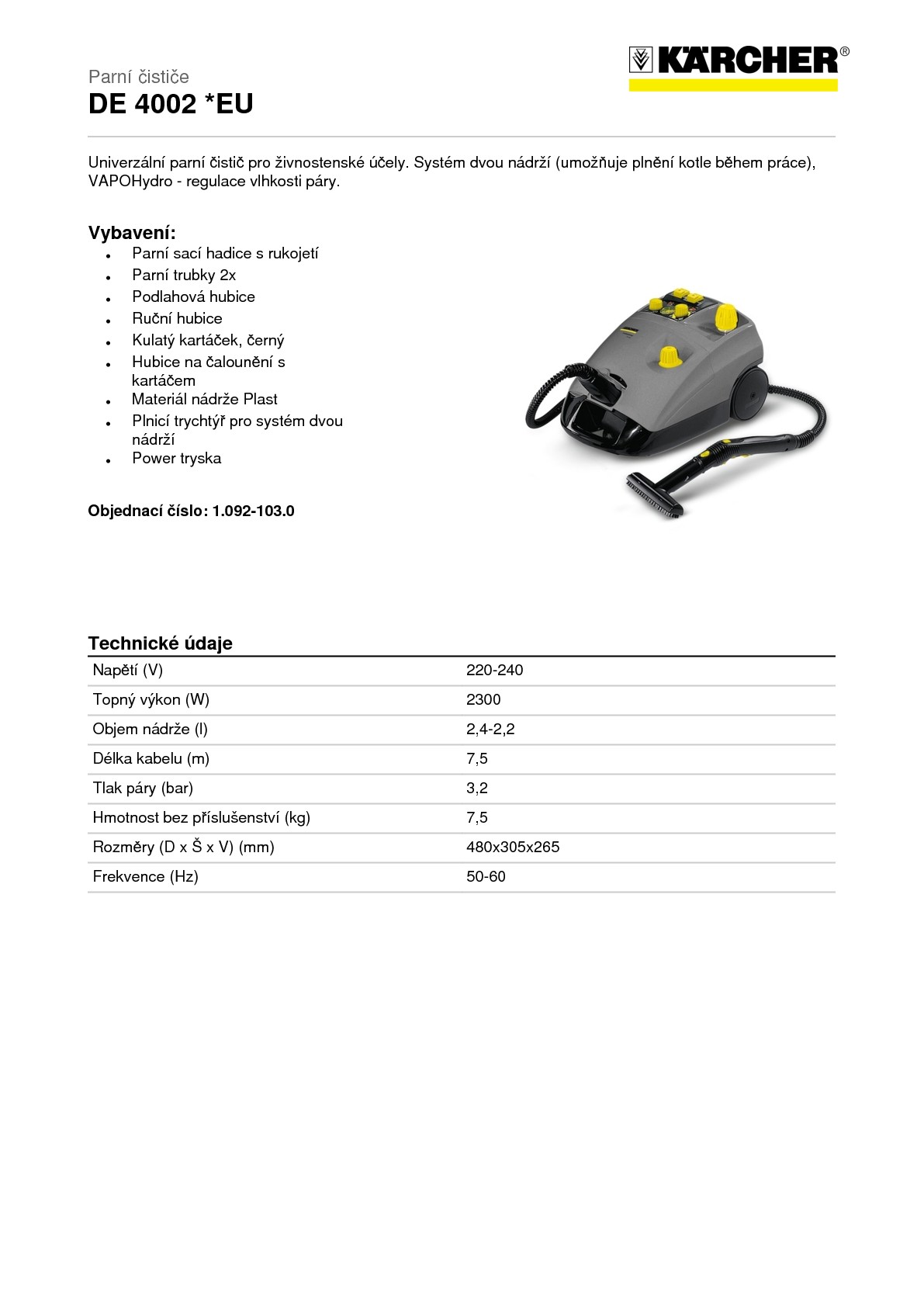 Profesionální Parní čistič KÄRCHER DE 4002 disponuje bohatým standardním příslušenstvím, které umožňuje mnohostranné použití přístroje v oblasti kuchyní i v sanitární oblasti, k čištění tvrdých a elastických podlahových krytin, oken, zimních zahrad i k čištění předmětů zařízení domácností. Horká pára uvolňuje rychle a efektivně nečistoty bez použití čisticích prostředků. Rozsáhlé příslušenství rozšiřuje oblasti použití tohoto přístroje.