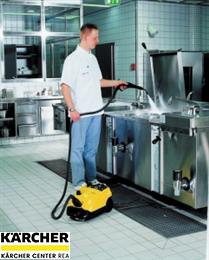 Profesionální parní čistič KÄRCHER DE 4002 je stroj pro použití v živnostenské oblasti. Zvláštností tohoto přístroje je kontinuální plnění parního kotle z dodatečné nádrže na vodu, což umožňuje pracovat bez přerušení. Z pouhých 4,6 litru vody se v parním kotli a v rezervní nádrži vytvoří zhruba 6000 litrů vodní páry, se kterou lze nepřetržitě pracovat po dobu až 5 hodin. Protože není rezervní nádrž pod tlakem, může se do ní kdykoliv doplňovat voda, aniž by se muselo čekat na ochlazení parního kotle.