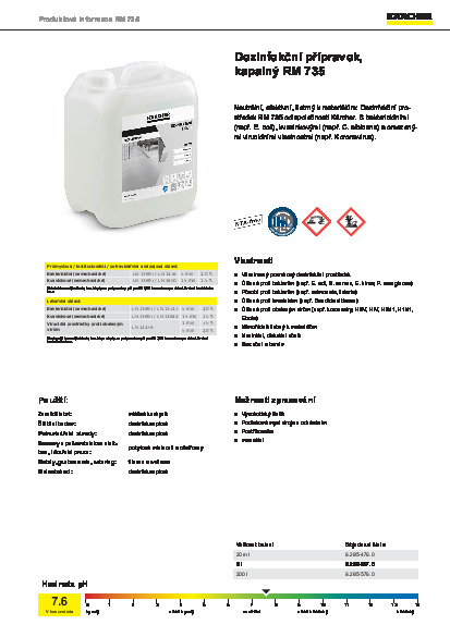 Ideální pro použití ve veřejných institucích, v hotelnictví a gastronomii, ve zdravotnictví a na mnoha dalších místech, náš tekutý dezinfekční prostředek RM 735 - testovaný v souladu s EN 14476 - je působivý díky své vysoké účinnosti v boji proti obzvláště široké škále patogenů, včetně nového koronaviru, SARS-CoV-2. Přes své významné baktericidní, kvasinkicidní a omezené virucidní vlastnosti je obzvláště šetrný k materiálům a může být dokonce použit na akrylové sklo (Plexiglas®), linoleum, PVC a eloxovaný hliník. Lze jej použít jako běžný sprej na utírání povrchů a také na větší plochy pomocí čisticího postřikovače, pračky, vysokotlakého čističe nebo PS 4/7 Bp Mister. Dezinfekční prostředek RM 735 je pH neutrální, neobsahuje žádné aldehydy, fenoly, alkohol ani chlór a nezanechává trvalý zápach.