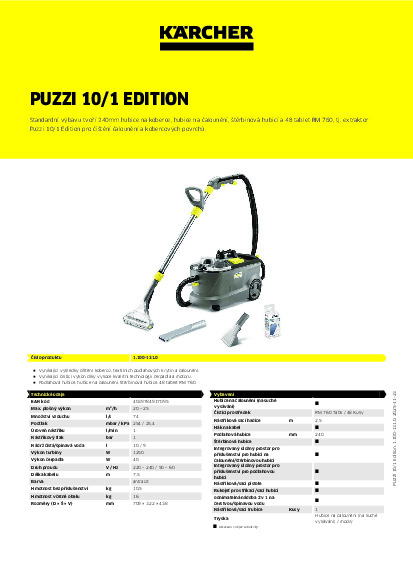 Standardní výbavu tvoří 240mm hubice na koberce, hubice na čalounění, štěrbinová hubicí a 48 tablet RM 760, tj. extraktor Puzzi 10/1 Edition pro čištění čalounění a kobercových povrchů.