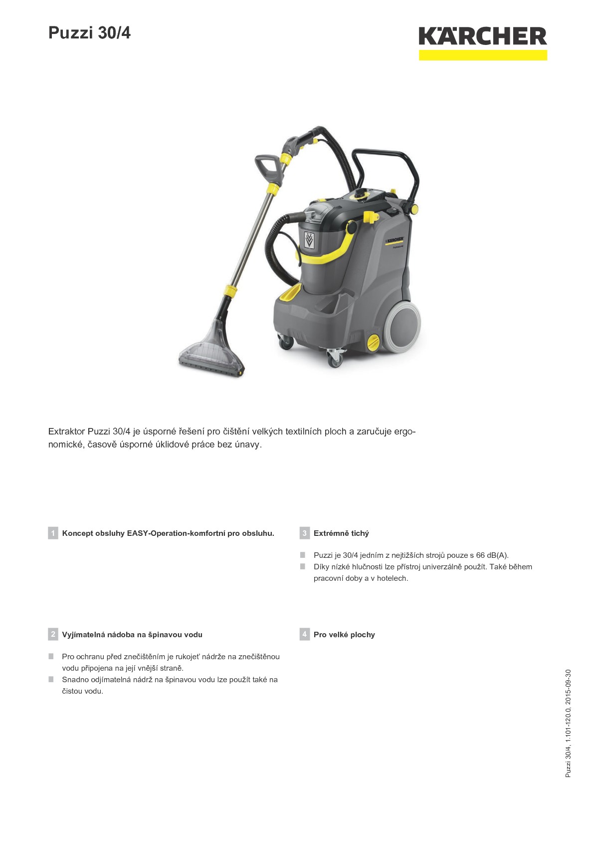 Extraktor Puzzi 30/4 je se svými 66 dB (A) nejtišším vysavačem svého druhu na mokré vysávání. Je vhodný k bezhlučnému čištění. Tento inovativní extraktor s nádrží na čistou vodu o objemu 30 l a 350 mm širokou podlahovou hubicí se obzvláště hodí na čištění velkých textilních ploch. Společnost Kärcher kladla při koncepci přístroje velký důraz na ergonomickou, časově úspornou práci, která vás neunaví. Koncept obsluhy EASY-Operation a ergonomický "Upright" koncept extrémně usnadňují obsluhu. Díky snadno pochopitelným piktogramům na přístroji odpadají zdlouhavé fáze zapracování se. Nádrž na znečištěnou vodu je vyjímatelná, rukojeť a tvar nádrže jsou určeny pro ergonomické přemístění. Nádrž lze snadno vyčistit a je tak vhodná pro naplnění čistou vodou. Krátká doba spouštění šetří čas a náklady. Přístroj nabízí až o 30 % rychlejší dobu schnutí než konkurenční přístroje. K tomu přispívá i flexibilní stírací stěrka, která zaručuje vždy optimální úhel sání. Extraktor Puzzi 30/4 se - dokonce i ležící s naplněnou nádrží na čistou vodu - snadno přenáší dokonce i po schodech díky svým velkým pojezdovým kolům.