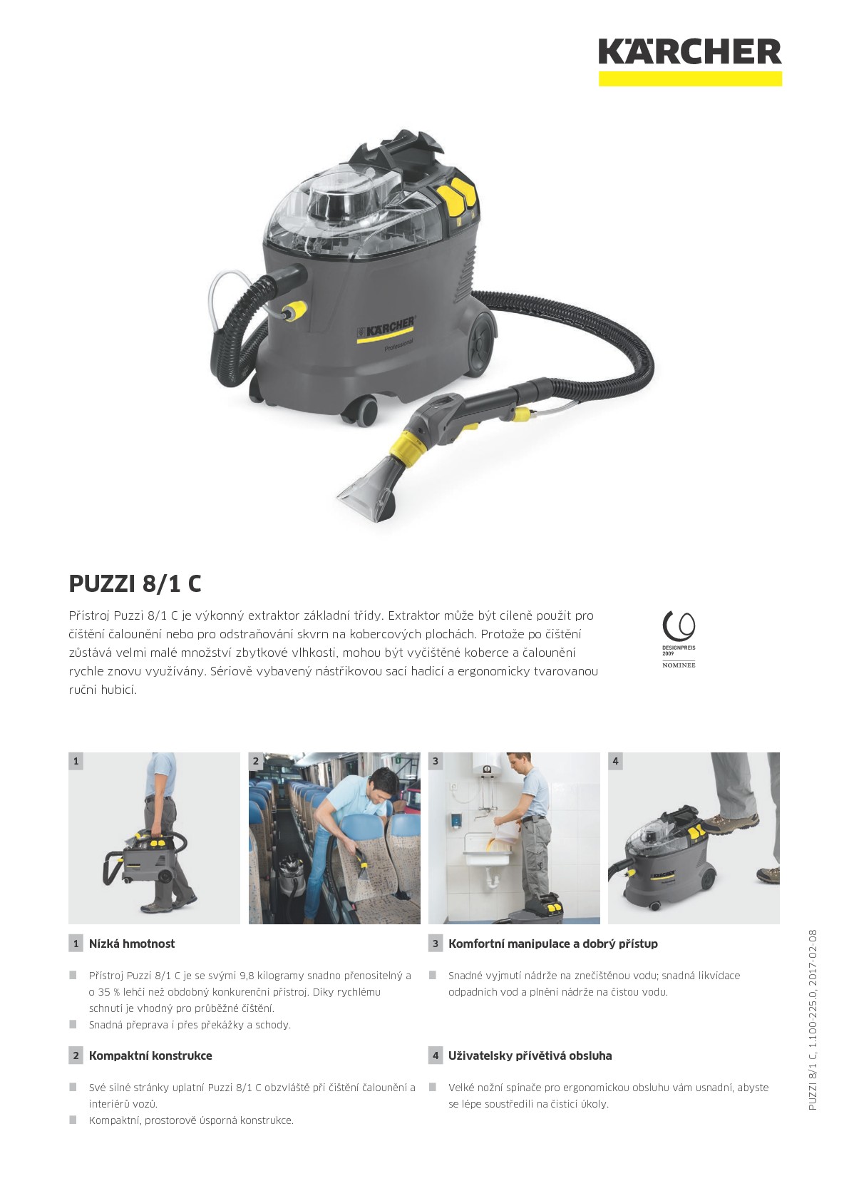 - Kompaktní konstrukce - Své silné stránky uplatní Puzzi 8/1 C obzvláště při čištění čalounění a interiérů vozů.