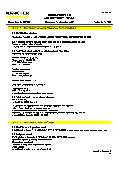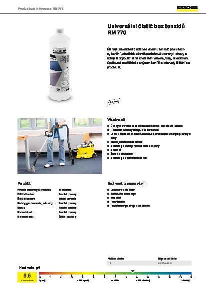 Díky své všestrannosti a čisticí síle je ideální volbou pro profesionální čištění všech textilních, pružných a tvrdých podlahových krytin: univerzální čistič bez povrchově aktivních látek RM 770 od společnosti Kärcher. Je dostatečně výkonný, aby odstranil nečistoty na bázi oleje, mastnoty a minerálů, zatímco jeho složení bez povrchově aktivních látek účinně snižuje opětovné znečištění textilních povrchů a mikroporézních kamenných a keramických dlaždic. Tento čisticí prostředek bez obsahu rozpouštědel a enzymů lze použít pro všechny účely, od extrakce rozprašováním pomocí našich extrakčních strojů Puzzi až po čištění pomocí podlahových mycích strojů a strojů na čištění koberců a dokonce i pro ruční průběžné čištění. Jeho nízkopěnivost zajišťuje obzvláště efektivní využití objemu nádrže strojů. Dodavatelé služeb mohou těžit také z obzvláště vysoké úrovně bezpečnosti uživatelů, protože univerzální čisticí prostředek RM 770, který neobsahuje povrchově aktivní látky, je zcela netoxický.