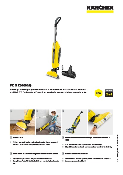 - Funkce 2 v 1 - Vytírání bez předchozího vysávání zachycením vlhkých a suchých nečistot i zvířecích chlupů v jediném pracovním kroku. Čistič tvrdých podlah FC 5 Cordless: Doba chodu až 20 minut díky silné lithium-ionové baterii.