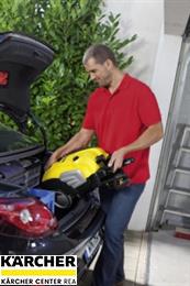 Snadná přeprava. Malé robustní vysokotlaké čističe řady Compact jsou opatřeny dvěma držadly a dají se vzít pohodlně s sebou kamkoliv. I v zavazadlovém prostoru automobilu lze tyto kompaktní přístroje rychle, snadno a prostorově úsporně uschovat.
