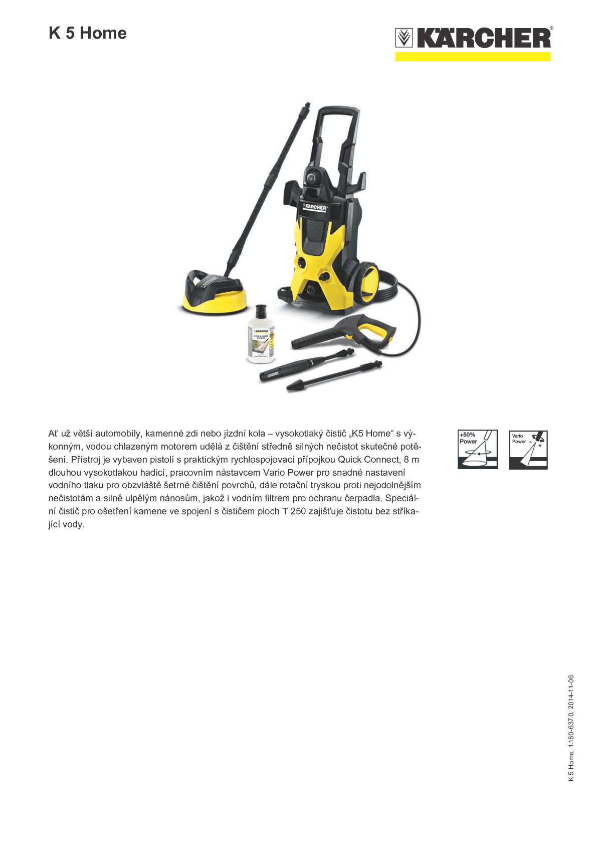 Ať už větší automobily, kamenné zdi nebo jízdní kola – vysokotlaký čistič „K5 Home“ s výkonným, vodou chlazeným motorem udělá z čištění středně silných nečistot skutečné potěšení. Přístroj je vybaven pistolí s praktickým rychlospojovací přípojkou Quick Connect, 8 m dlouhou vysokotlakou hadicí, pracovním nástavcem Vario Power pro snadné nastavení vodního tlaku pro obzvláště šetrné čištění povrchů, dále rotační tryskou proti nejodolnějším nečistotám a silně ulpělým nánosům, jakož i vodním filtrem pro ochranu čerpadla. Speciální čistič pro ošetření kamene ve spojení s čističem ploch T 250 zajišťuje čistotu bez stříkající vody.