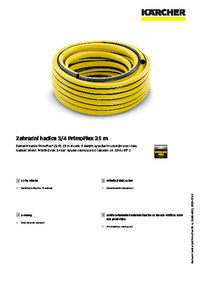Zahradní hadice PrimoFlex® o průměru 3/4" a délce 25 m je vhodná pro zavlažování malých až velkých ploch a zahrad. Trojvrstvá zahradní hadice s tkaným vyztužením odolným proti tlaku neobsahuje ftaláty, kadmium, barium a olovo a tím neškodí zdraví. Vnější vrstva odolná proti UV a počasí. Ochranný materiál a mezivrstva, která nepropouští světlo, zabraňuje vytváření řas v hadici. Průtržný tlak je 24 bar. Mimo to se zahradní hadice vyznačuje vysokou odolností proti teplotám od -20 do 65° C. Na tuto zahradní hadici poskytujeme záruku 12 let. Zahradní hadice ze zavlažovací řady Kärcher jsou velmi flexibilní, robustní a odolné proti zlomení. Přednosti jsou jasné: dlouhá životnost a jednoduchá manipulace.