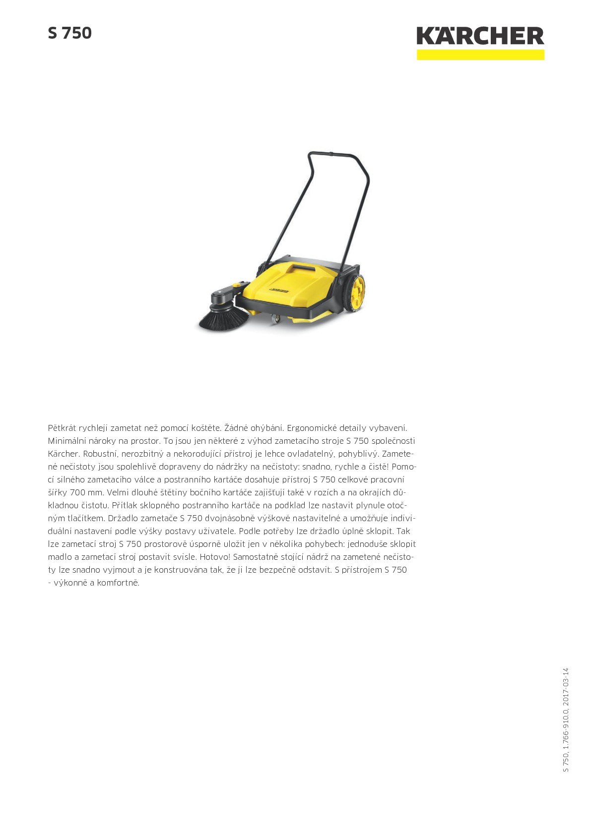 Výkonný a komfortní zametací stroj Kärcher S 750. Se zametacím strojem Kärcher S 750 lze zametat chodníky, dvory, příjezdy několikanásobně rychleji než s běžným koštětem jednoduše, efektivně a čistě. Výškově nastavitelné madlo umožňuje nastavení p