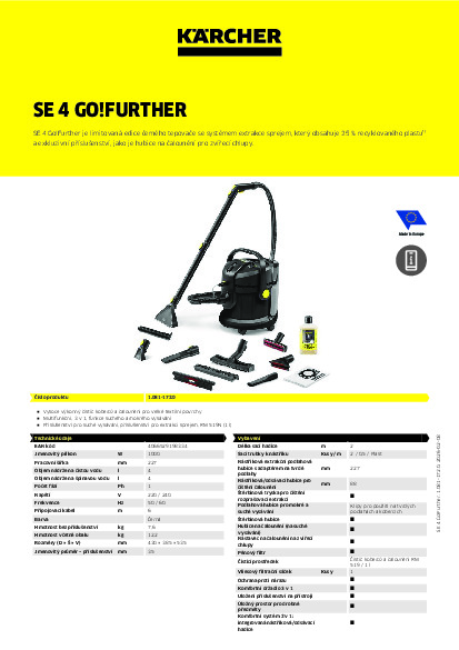 Čistič se sprejovou extrakcí, který jde ještě o krok dál – limitovaná edice černého modelu SE 4 Go!Further, vyrobená z 25 % recyklovaného plastu¹⁾ s exkluzivním příslušenstvím, nabízí nejlepší výsledky čištění a vysoký komfort. Sprejový extraktor SE 4 s atraktivním designem saní zajišťuje hygienickou čistotu až do hloubky vláken na mnoha textilních površích. Osvědčená technologie sprejové extrakce od společnosti Kärcher poskytuje nejlepší výsledky čištění: čerstvá voda z vodovodu a čistič koberců Kärcher RM 519 se pod tlakem nastříkají hluboko do textilních vláken a poté se spolu s uvolněnými nečistotami vysají zpět – ideální pro rodiny, alergiky a domácnosti s domácími mazlíčky. Zařízení je multifunkční produkt 3 v 1, který funguje také jako plnohodnotný vysavač na mokré a suché vysávání. Velká průhledná 4litrová nádrž na čerstvou vodu je odolná proti nárazům a lze ji vyjmout, což usnadňuje její plnění a vyprazdňování. Rukojeť 3 v 1 je navržena tak, aby se nádoba snadno přenášela, otevírala, zavírala a vyprazdňovala. Dodávané příslušenství lze úhledně uložit na samotném zařízení. Zařízení se po použití snadno čistí, což zajišťuje dlouhou životnost produktu.