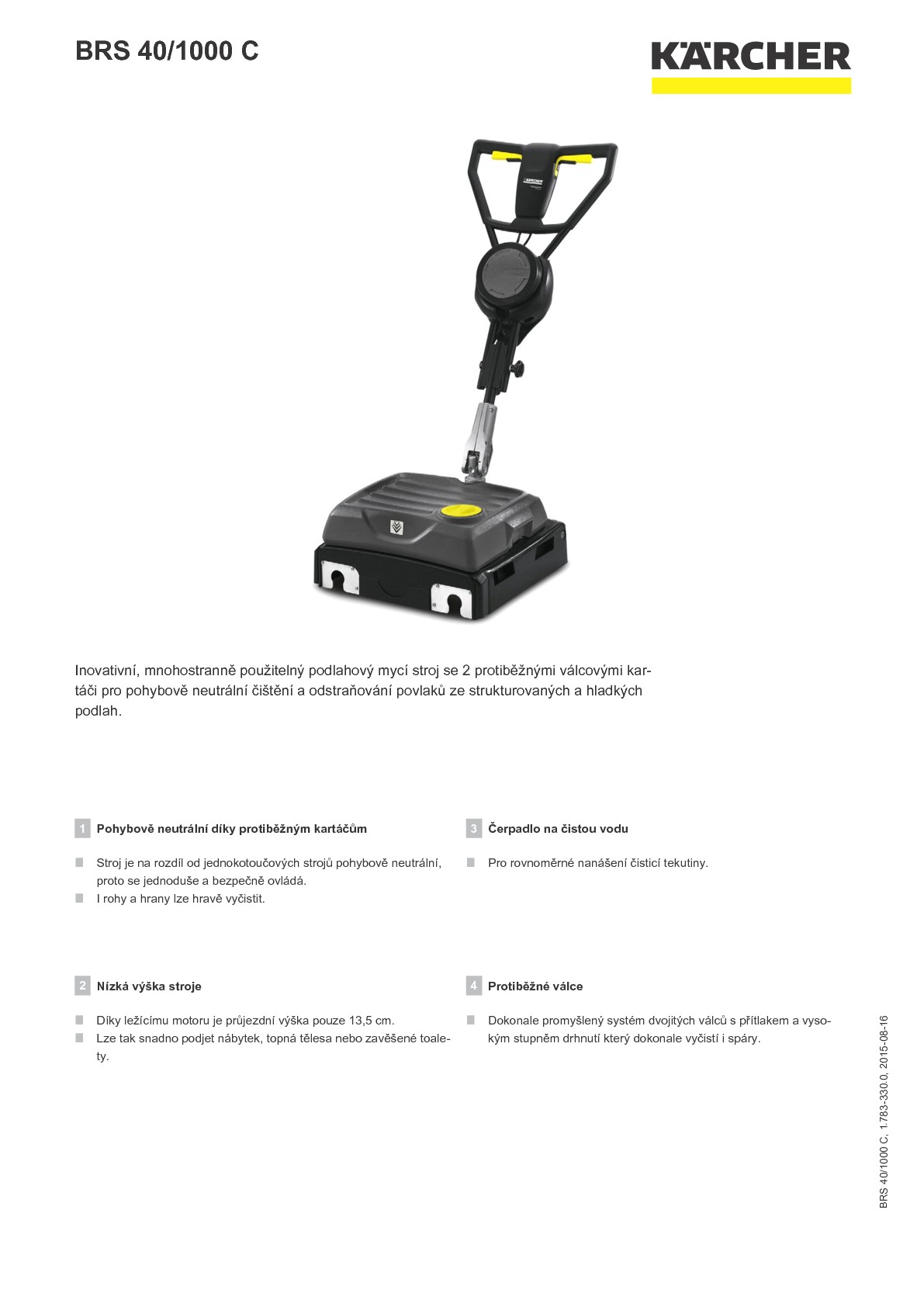 Podlahový mycí stroj BRS 40/1000 C spojuje přednosti jednokotoučového stroje s přednostmi stroje s technologií válců. Nabízí oběma směry až o 90° otočnou a aretovatelnou rukojeť. Dva protiběžné válcové kartáče o délce 40 cm vytvářejí max. tlak 230 g/cm². Tak lze důkladně vyčistit i profilované plochy jako bezpečnostní dlaždice nebo gumové nopkové podlahy. Na rozdíl od klasických jednokotoučových strojů je BRS 40/1000 C pohybově neutrální. Tak dokáže strojem dobře manévrovat i nezaučený personál. V základní poloze pracuje výkyvně zleva doprava - pro velký plošný výkon. Pokud rukojeť zapadne do pravého úhlu, může pojíždět v přesných drahách vpřed a vzad, což dovoluje vyčistit i krajové prostory. Díky nízké celkové průjezdní výšce 170 mm – na stranách pouze 100 mm – lze dobře vyčistit i těžko přístupné části. Asynchronní motor 1600 W je robustní a tichý. Nosič motoru je vyrobený z masivníhohliníku, deska z nerezavějící ušlechtilé oceli. Jednoduchá výměna kartáčů bez použití nářadí. Dvě stabilní kolečka zajišťují snadnou přepravu. Sklopná rukojeť pro nenáročné uložení stroje a díky čemuž se BRS 40/100 C vejde do každého zavazadlového prostoru.