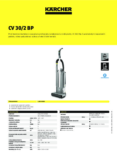 CV 30/2 Bp, s objemem nádoby 3 litry, je prvním bateriovým kartáčovým vysavačem pro profesionální čištění všech kobercových a tvrdých ploch. Díky automatickému rozpoznání podlahy se dokonale přizpůsobí podlahové krytině. Výkonný kartáč čistí do hloubky vláken textilních podlah a viditelně je rovná. Díky jeho mimořádně nízké podjezdové výšce můžete čistit s kompaktním a obratným akumulátorovým kartáčovým vysavačem bez námahy i pod postelemi a ostatním vybavením. Díky tomu je vhodný pro pracovníky úklidových firem při čištění v budovách nebo v hotelnictví. Další výhodu představuje rychlá a hygienická funkce samočištění kartáčového válce. Vlasy zachycené kartáčovým válcem se oddělí stisknutím nožního pedálu a zbytky automaticky odsají. Kartáčový vysavač CV 30/2 Bp bez překážejícího kabelu je koncipován velmi přívětivě pro uživatele a disponuje inovativní rukojetí vybavenou vypínačem, režimem eco!efficiency a LED displejem se zobrazením zbývajícího času baterie. U tohoto provedení doporučujeme samostatně objednat výkonnou baterii Kärcher Battery Power+ a příslušnou nabíječku. Navíc můžete zvolit vysoce účinný filtr HEPA 14.
