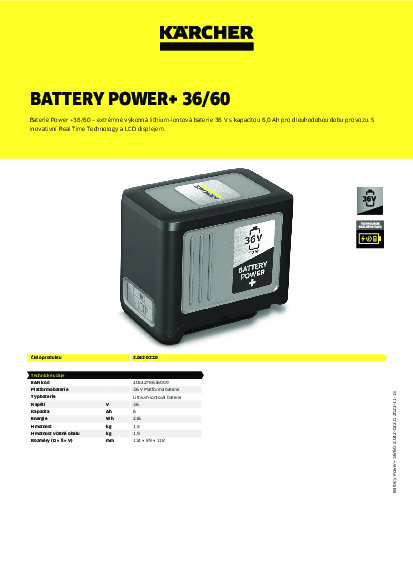 Lithium-iontová baterie Kärcher + 36 je kompatibilní s veškerou AKU technikou Kärcher v platformě 36 V. Zaujme jak svým neuvěřitelným výkonem, tak dlouhou dobou provozu díky kapacitě 6,0 Ah. Kromě toho však disponuje také další rozsáhlou výbavou a bezpečnostními prvky. Například efektivní řízení teploty zaručuje bezpečnou regulaci tepla baterie, tedy maximální bezpečnost i při nejvyšším výkonu baterie. Dále je AKU baterie vybavena robustním, nárazuvzdorným krytem, který ji velmi účinně chrání i před vodou v souladu s IPX5. Integrovaná kontrolka napětí s nadproudovou ochranou zabraňují poškození článků způsobeným přepětím, silným vybitím a nadměrným proudem. Inovativní Real Time Technology umožňuje uživatelům sledovat na LCD displeji přesné hodnoty na baterii: doba provozu, doba nabíjení a úroveň nabití.