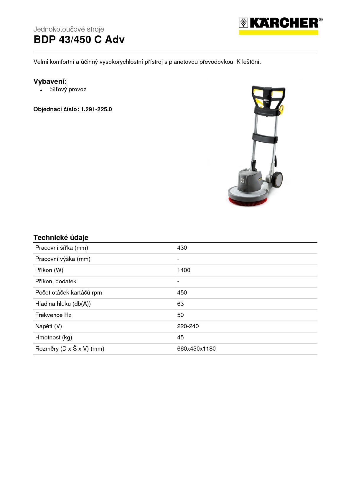 Jednokotoučový podlahový mycí stroj Kärcher BDP 43/450 C Adv je vybaven dvěma stabilními hliníkovými tyčemi. Pomocí tohoto přístroje můžete vyleštit tvrdé i elastické podlahové krytiny. Je vhodný také k zapracování pečujících prostředků na dřevěné podlahy. Díky vysokému počtu otáček (450 ot/min) můžete rychle a důkladně pracovat. Bezúdržbová planetová převodovka a silný motor jsou spolu optimálně sladěny. Volitelně je možné dokoupit odsávací jednotku vč. kruhu, kterou lze snadno namontovat na dvojité tyčové madlo. Tak lze zabránit víření prachu.