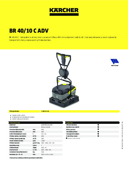Kärcher BR 40/10 C Adv je velice výkonný podlahový mycí automat, určený pro čištění menších a středně velkých tvrdých ploch při menším až silném znečištění. Stroj je vybaven dvěma, proti sobě rotujícími válcovými kartáči a dvěma stíracími, sacími lištami. Ty jsou umístěny na přední a zadní straně kartáčovací hlavy a díky tomu a díky oboustranně sklopné rukojeti je možno se strojem čistit a odsávat směrem vpřed i vzad. Válcové kartáče jsou poháněny vlastními elektromotory a odsávání znečištěné vody z podlah zajišťuje kvalitní sací motor s turbínou. Na stroji je možno díky otočnému šroubu velice jednoduše měnit přítlak kartáčů, aby co nejlépe vyhovoval druhu a povaze čištěné plochy. Díky tomu je možno docílit mnohem kvalitnějšího a důkladnějšího čištění. Systém dvou nádob v jedné umožňuje lepší využití při čištění a mnohem snadnější manipulaci při doplňování a nebo vyprazdňování. Nádrže jsou umístěny na kartáčovací hlavě a tvoří s ní tak ucelenou kompaktní jednotku. Navíc je nádrž opatřena rukojetí s možností aretace, díky které je její vyjmutí, vyprázdnění a nošení velmi jednoduché a pohodlné.