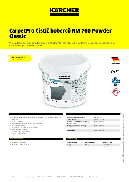 CarpetPro Čistič koberců RM 760 Pulver Classic je velmi účinný prášek pro extrakční čištění textilních podlahových krytin, obkladů stěn a čalounění (včetně smíšených tkanin a plně syntetických vláken).