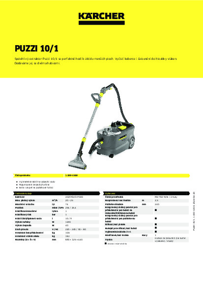 Extraktor Kärcher Puzzi 10/1 Adv s podlahovou hubicí a hubicí na čalounění se hodí obzvláště pro hygienické a efektivní čištění menších až středně velkých ploch. S nástřikovým tlakem 1 bar se tento přístroj pro nástřikovou extrakci postará o šetrné hloubkové čištění textilních ploch a dosahuje zvláště při čištění čalounění a koberců přesvědčivých výsledků. Díky úzké podlahové hubici se přístroj optimálně hodí také pro použití ve stísněných prostorových podmínkách. Flexibilní sací stěrka umí bezproblémově vyčistit i silně zastavěné oblasti. Přístroj pro nástřikovou extrakci je vybaven vestavěným kabelem na zavěšení háku, jakož i fixací ručního nářadí a sací trubky.