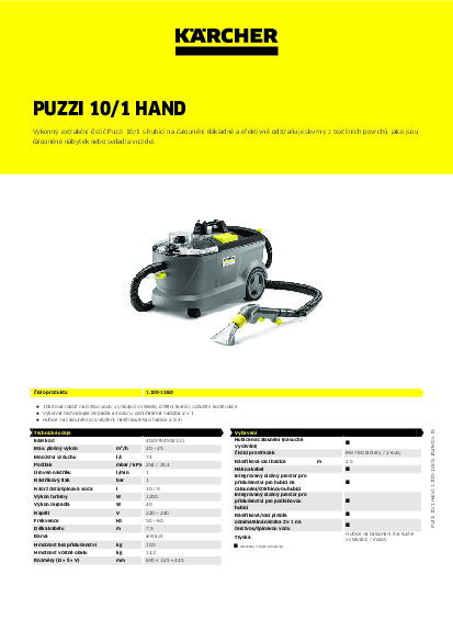 Působivý díky prvotřídním hygienickým výsledkům čištění a vysoké účinnosti: robustní extrakční čistič Puzzi 10/1 s hubicí na čalounění pro odstraňování skvrn z malých až středně velkých textilních povrchů. Hluboké vstřikování čisticího roztoku do textilních vláken a následné odsávání s vynikajícím sacím výkonem zajišťují rychlé vyschnutí textilií a jejich rychlé opětovné použití. Extraktor je standardně vybaven tryskou na čalounění, která je vhodná zejména pro stísněné prostory, jako jsou interiéry vozidel. Velká tlačítka, která lze ovládat rukou nebo nohou, jsou velmi pohodlná. Díky ergonomické rukojeti je přeprava snadná i jednou rukou. Víko přístroje a ruční hubice jsou průhledné, aby byl lepší přehled o znečištěné vodě. Extraktor má praktický háček na kabel pro bezpečné uložení napájecího kabelu, a tím i pro snadnou přepravu a skladování stroje.