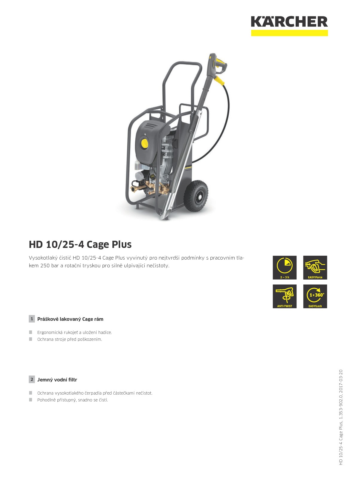 Nejtvrdší pracovní úkoly v komplikovaném terénu, jaké se vyskytují především v zemědělství, stavebnictví nebo komunálních službách, zvládne náš vysokotlaký čistič HD 10/25-4 Cage Plus bez problémů. O to se postará zvlášť stabilní rámová konstrukce z trubek, která jednak účinně zabraňuje škodám a jednak zajišťuje dobrý přístup ke všem důležitým dílům, což představuje pro servis velkou výhodu. S pracovním tlakem 250 bar, vysokým průtokem 1000 l vody za hodinu a naší inovativní rotační tryskou zvládne tato tlakovka i ty nejhorší nečistoty. Aby ani pracovní komfort nepřišel zkrátka, o to se starají vysokotlaká pistole EASY!Force a patentované rychlospojky EASY!Lock: Práci bez únavy a krátkou dobu přípravy zajišťují vysokotlaká pistole EASY!Force a rychlospojky EASY!Lock: Zatímco vysokotlaká pistole EASY!Force využívá zpětný ráz vysokotlakého paprsku ke snížení síly potřebné pro stisk rukojeti na nulu, dovolují rychlospojky EASY!Lock v porovnání s běžným šroubením až 5 krát rychlejší manipulaci, aniž by došlo k ústupkům v robustnosti a životnosti. Snadnou dopravu umožňuje smysluplné zavěšení pro jeřáb přímo na rámu.