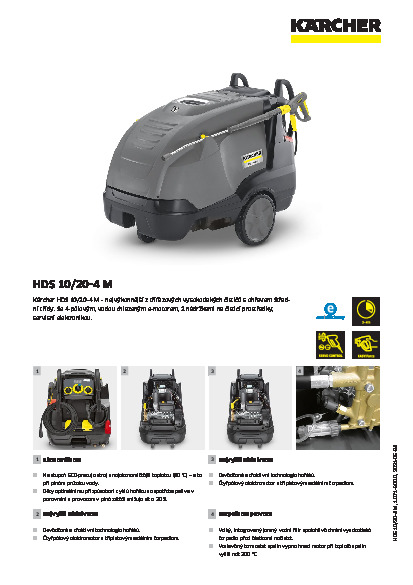 Nekompromisní ve všech ohledech: nejvyšší tlak, nejvyšší průtok. Vysokotlaký čistič Kärcher HDS 10/20-4 M s ohřevem je nejsilnějším strojem Kärcher Střední třídy. Inovativní stupeň eco!efficiency, přesné dávkování čisticích prostředků a optimalizovaná technika hořáku snižují zatížení životního prostředí a Vaší peněženky na minimum, zatímco se patentovaná technologie trysek, keramické písty, turbodmychadlo a vysoký stupeň účinnosti čerpadla starají o nejlepší výsledky čištění. Optimální je i obslužnost stroje, kterou zajišťuje centrální přístrojová deska pro intuitivní ovládání. LED kontrolky i promyšlený koncept mobility velmi zjednodušují manipulaci se strojem i jeho přepravu. Snadný přístup ke všem součástkám ulehčuje i veškeré servisní a údržbové práce. Všechna provozní data pro diagnózu poruch tak lze pohodlně kdykoliv vyvolatje zajištěna sledováním spalin, robustním podvozkem odolným proti korozi, adaptací systémové péče, třípístovým axiálním čerpadlem Snadný přístup ke všem komponentům vyžadujících údržbu a servisní spínač s jehož pomocí mohou být vyvolána provozní data pro diagnózu poruch.