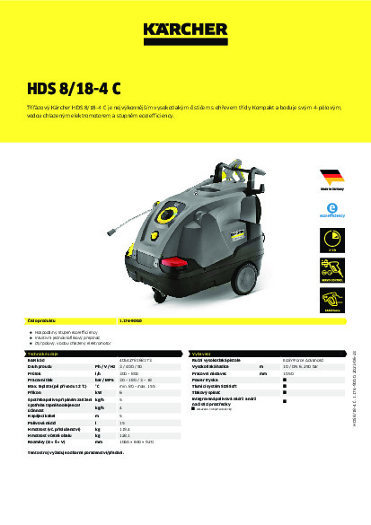 Vysokotlaký čistič s ohřevem HDS 8/18-4 C je nejvýkonnějším stroje třídy Kompakt. Třífázový stroj se čtyřpólovým, vodou chlazeným motorem nabízí vše, co dnes lze očekávat v komfortu obsluhy, ergonomii a efektivním využívání zdrojů. Jednoduchá obsluha jedním knoflíkovým přepínačem přesvědčí uživatele právě tak jako překvapivě vysoká mobilita, kterou zajišťují velká kola a vodicí kolečko. Zatímco vysokotlaká pistole EASY!Force využívá zpětný ráz vysokotlakého paprsku ke snížení síly potřebné pro stisk rukojeti na nulu, dovolují rychlospojky EASY!Lock v porovnání s běžným šroubením až 5 krát rychlejší manipulaci, aniž by došlo k ústupkům v robustnosti a životnosti. Bezpečnost nabízí odolný podvozek, ve kterém jsou integrovány nádrže na čisticí prostředek a palivo. Užitečné přihrádky pro příslušenství a nářadí doplňují širokou paletu vybavení stroje HDS 8/14-C.