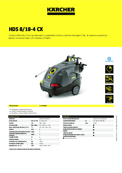 Vysokotlaký čistič s ohřevem HDS 8/18-4 CX je nejvýkonnějším stroje třídy Kompakt. Třífázový stroj se čtyřpólovým, vodou chlazeným elektromotorem nabízí vše, co dnes lze očekávat v komfortu obsluhy, ergonomii a efektivním využívání zdrojů. Například je tento stroj vybavený vestavěným bubnem na navíjení hadice včetně vysokotlaké hadice o délce 15 m. Jednoduchá obsluha jedním knoflíkovým přepínačem přesvědčí uživatele právě tak jako překvapivě vysoká mobilita, kterou zajišťují velká kola a vodicí kolečko. Zatímco vysokotlaká pistole EASY!Force využívá zpětný ráz vysokotlakého paprsku ke snížení síly potřebné pro stisk rukojeti na nulu, dovolují rychlospojky EASY!Lock v porovnání s běžným šroubením až 5 krát rychlejší manipulaci, aniž by došlo k ústupkům v robustnosti a životnosti. Bezpečnost nabízí odolný podvozek, ve kterém jsou integrovány nádrže na čisticí prostředek a palivo. Užitečné přihrádky pro příslušenství a nářadí doplňují širokou paletu výbavy stroje HDS 8/18-4 CX.