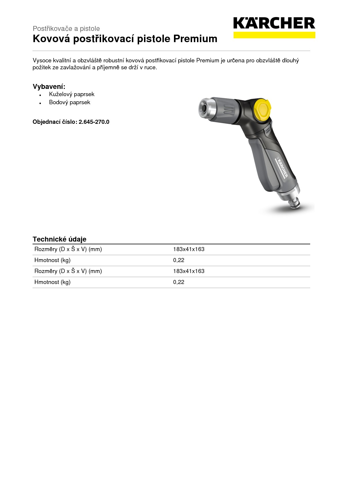 Nejvyšší požadavky vyžadují nejkvalitnější materiál. Kovová postřikovací pistole Premium se nejen drží příjemně v ruce, ale díky zpracování kovu je extrémně robustní a má dlouhou životnost. Otočná rukojeť, se kterou nastavíte aretovatelný spouštěč dopředu nebo dozadu, Vás přesvědčí individuálním uživatelským komfortem, který může nabídnout jen společnost Kärcher. Průtok vody lze dle potřeby nastavit regulačním ventilem, který se ovládá pouze jednou rukou. Kovová postřikovací pistole Premium disponuje 2 obrysy postřiku: bodovým a kuželovým paprskem. Ty můžete dle potřeby plynule nastavovat. Například pro zavlažování květinových a rostlinových záhonů nebo pro odstranění hrubých nečistot z teras nebo zahradního nábytku. Ostatně: Postřikovače a spojky od společnosti Kärcher jsou kompatibilní se všemi dostupnými zacvakávacími systémy a k Vaší zahradní hadici je snadno připojíte.