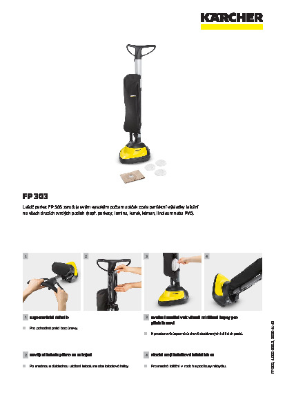 Leštění snadno a rychle. S leštičem parket FP 303 nabízí společnost Kärcher kompletní řešení pro optimální péči a údržbu tvrdých podlah: leštič podlah, vysoce kvalitní lešticí pady a nejrůznější ošetřující prostředky - pro každou podlahovou krytinu nabízí tu správnou kombinaci. Svými vysokými nároky na výkon, ergonomii, komfort a uživatelskou přívětivost splňuje FP 303 perfektně každé přání. Zajišťuje na všech tvrdých plocách, jako např. parketách, laminu, kamenných podlahách, PVC, korku nebo linoleu, perfektní výsledky leštění, a to díky vysokému počtu otáček a optimální hmotnosti. Díky své inovované trojúhelníkovité lešticí hlavě dosáhne dokonce i do rohů. Plochá lešticí hlava umožňuje dokonce i leštění pod jednotlivými kusy nábytku. Ergonomicky tvarované držadlo zaručuje komfortní manipulaci s přístrojem, která vám šetří síly. Sací funkce přístroje zajišťuje snadné odsávání prachu z leštění. Přívodní kabel může být uložen přímo na háku na navíjení kabele, který je umístěn na rukojeti. Součástí přístroje FP 303 je vysoce kvalitní textilní vak, který obsahuje filtrační sáček. V samostatné zásuvce na příslušenství můžete uložit prostorově úsporně odnímatelné lešticí pady.Se svými snadno ovladatelnými kolečky se leštič FP 303 bez větší námahy snadno pohybuje. Leštěním je podlahám poskytována optimální péče a stávají se odolnějšími proti všem druhům opotřebení nebo proti jiným vnějším vlivům. Jsou odolnější proti vlhkosti a neznečistí se již tak snadno jako dříve. K tomu se přidává ještě optický aspekt - zazáří v novém lesku a nechají své barvy ještě více vyniknout. V ošetřujících prostředcích na podlahy jsou obsaženy ošetřující látky, např. vosky, které se vysokou rychlostí lešticích padů stlačí a spojí se tak v jednolitý celek. Výsledkem je lesklý efekt a ošetřená vrstva je podstatně odolnější než dříve.