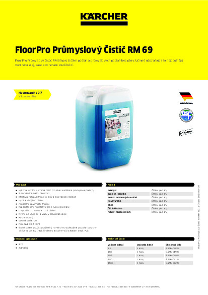 FloorPro průmyslový čistič RM 69 pro čištění s nízkým obsahem pěny, pro průmyslové podlahy. Účinně odstraňuje i ty nejodolnější mastnoty, oleje, saze a minerální nečistoty.