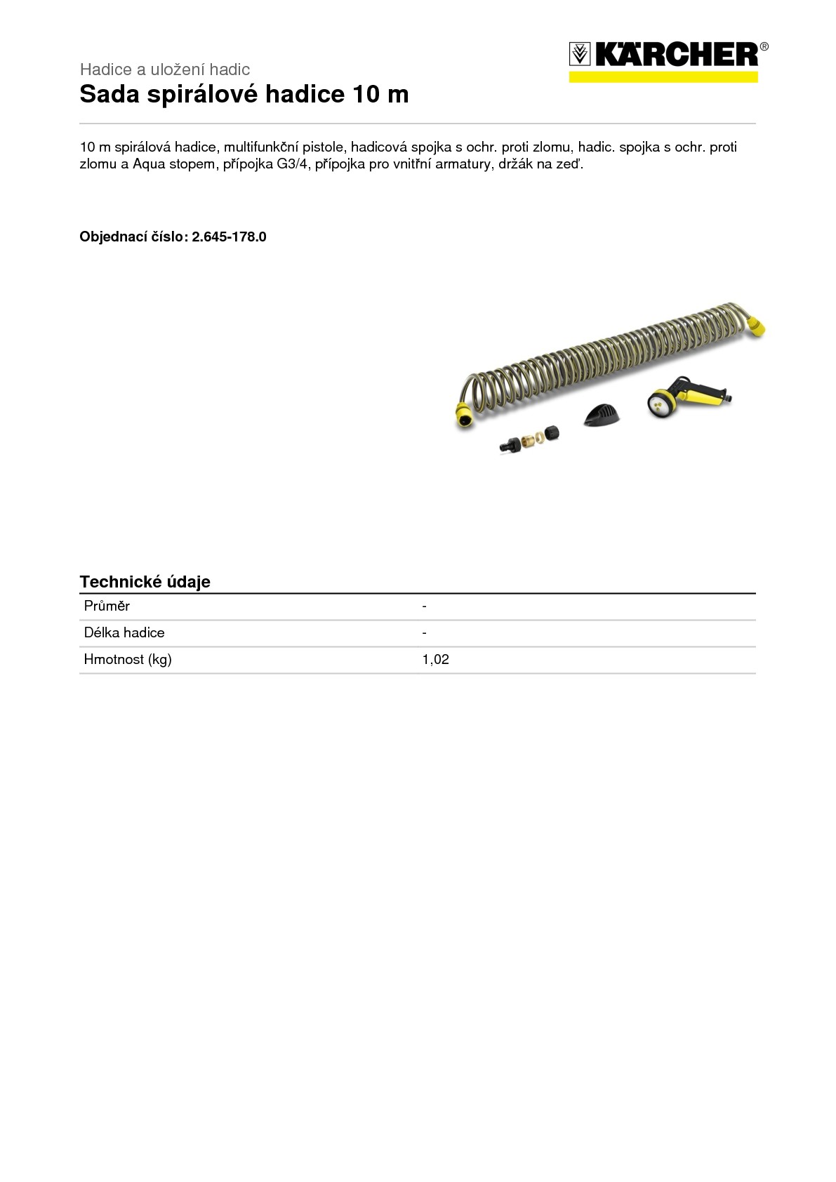 Sada spirálové hadice Kärcher nabízí ideální předpoklady pro pravidelné zavlažování v malých zahradách, na terasách, balkonech nebo při kempování. Již není nutné žádné zdlouhavé a namáhavé nošení zalévacích konví nebo tahání zahradních hadic. Sada spirálové hadice Kärcher je tím pravým pomocníkem a vždy připravena na všechny možné typy zavlažování. Vybavení: 10 m spirálová hadice neobsahující ftaláty, odolná proti UV záření, multifunkční zavlažovací pistole, 1 x spojka pro spirálovou hadici s ochranou proti zlomení, 1x spojka pro spirálovou hadici s ochranou proti zlomení a Aqua Stopem, kohoutová přípojka G3/4, kohoutová přípojka pro vnitřní armatury a držák na stěnu. S pomocí sériově dodávané multifunkční postřikovací pistole lze snadno odstranit i hrubé nečistoty ze zahradního nářadí. Spirálová hadice získá po každém použití zpět svůj kompaktní tvar a může být úsporně uložena na držáku na stěnu. Díky sériově dodávané kohoutové přípojce pro vnitřní armatury může být spirálová hadice napojena dokonce na kuchyňskou vodovodní baterii.