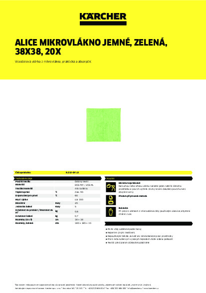 Zelená utěrka Alice z mikrovlákna od společnosti Kärcher je vlasově pletený, objemný čisticí hadřík z mikrovlákna určený pro stříkání a vlhké čištění. Díky své obzvláště jemné struktuře pronikají vlákna této opakovaně použitelné textilie hlouběji do čištěných povrchů, než je to možné u konvenčních vláken, a zachycuje prach, odolnou špínu a bakterie rychleji a důkladněji. Díky tomu je utěrka obzvláště vhodna pro použití v oblastech, kde mají velký význam objemy sběru nečistot a schopnost absorbovat nečistoty, jako je zdravotnictví nebo hotelnictví a stravování. Kromě zelené je k dispozici také v červené, žluté a modré, v souladu s obvyklým barevným kódováním používaným profesionály v oblasti čištění pro různé oblasti použití. K čištění lze utěrku použít suchý nebo předem navlhčený, ale je také možné nastříkat čisticí prostředek přímo na suchý nebo navlhčený hadřík.