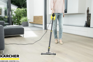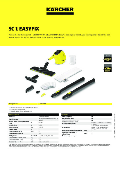 Kompaktní parní čistič Kärcher 2-v-1 SC 1 EasyFix (se sadou na čištění podlah) najde univerzální uplatnění v celé domácnosti a čistí zcela bez použití chemie. Při důkladném čištění s parním čističem Kärcher odstraníte 99,99 % všech bakterií běžných v domácnosti, které se vyskytují na tvrdých plochách. Díky svým kompaktním rozměrům je zařízení předurčeno pro průběžné, rychlé a důkladné čištění. Následně ho lze skladovat přímo na místě, kde se používá, bez velký nároků na místo. Ať armatury, dlaždice, varné desky, digestoře nebo i ty nejmenší rýhy a prohlubně - účinná pára a bohatý program příslušenství se postarají o dokonalou čistotu. Sada na čištění podlah EasyFix připraví praktický ruční parní čistič obratem ruky na čištění podlah. Během krátké chvíle odstraníte silně ulpívající nečistoty a usazeniny tuku.