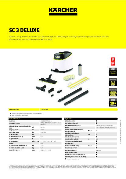 SC 3 Deluxe Anniversary Edition k 90. výročí založení společnosti je limitovaná barevná varianta se speciálním příslušenstvím. Parní čistič je připraven ke spuštění po pouhých 30 sekundách zahřívání a na tvrdých površích odstraňuje až 99,999 % virů* a 99,99 % všech běžných domácích bakterií**. Podlahová hubice EasyFix s flexibilním kloubem a lamelovou technologií poskytuje vynikající ergonomii a dokonalé výsledky čištění. Dodatečně dodávaná flexibilní ruční hubice umožňuje důkladné a pohodlné čištění rovných i zakřivených hladkých povrchů jemným tlakem spolu s vysoce kvalitní utěrkou z mikrovlákna, a to i v případě odolných nečistot. Dvoustupňová regulace páry zaručuje, že se proud páry pokaždé dokonale přizpůsobí povrchu a míře znečištění. Přihrádka na příslušenství na samotném přístroji poskytuje jednoduchý a bezpečný způsob uložení příslušenství, kabelů a hadic. Mezi další funkce patří integrovaná kazeta na odstraňování vodního kamene, nádržka na vodu, kterou lze kdykoli doplnit pro nepřetržité čištění, a světelný LED pásek pro indikaci provozních režimů.