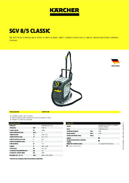 SGV 8/5 Classic umožňuje parní čištění a mokré vysávání, nabízí vynikající poměr ceny a výkonu, robustní konstrukci a dlouhou životnost.