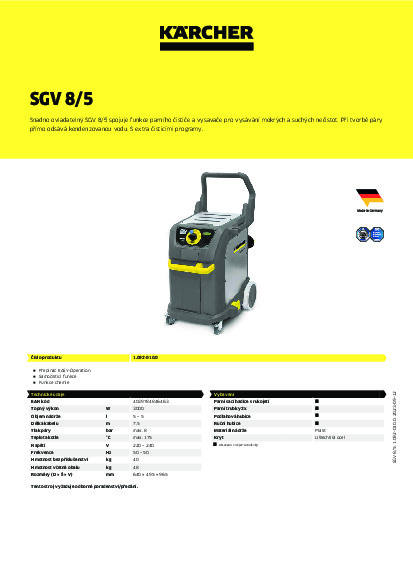 Parní vysavač SGV 8/5 vám splní každé přání. Obzvláště uživatelsky přátelský parní vysavač nabízí praktickou funkci samočištění a a zaručuje tak stále hygienickou čistotu. Kromě toho si vás přístroj získá svou snadnou a pohodlnou obsluhou. Obslužný přepínač EASY-Operation a ergonomická inovovaná rukojeť pro ovládání funkce páry a vysávání velmi zkrátí dobu zapracování. Během použití přístroje ovládáte všechny funkce přímo, rychle a flexibilně. Moderní režim eco!efficiency nešetří jen vaše náklady. Umožňuje i práci v oblastech citlivých na hlučnost. Příslušenství je uložené proti případné ztrátě a znečištění přímo na přístroji, čímž je stále a rychle při ruce, kdykoliv jej potřebujete. Tak může uživatel pouze v jednom pracovním kroku (1kroková metoda) vytvářet páru, s její pomocí čistit a odsávat kondenzovanou vodu a rozpuštěné nečistoty. U konceptu zařízení byl kladen důraz především na obsluhu přátelskou pro zákazníka, specifické programy podle druhu čištění a uložení příslušenství bezpečné proti ztrátě.