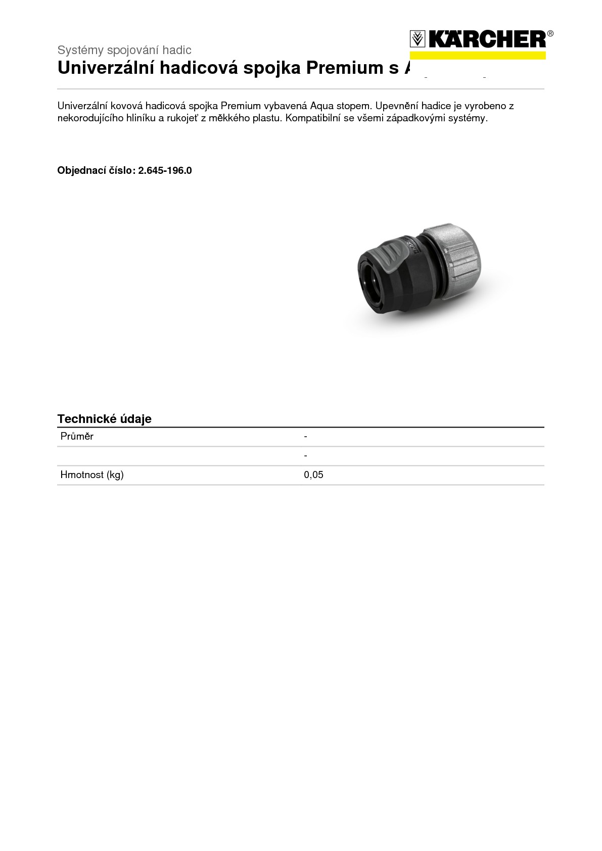 Univerzální kovová hadicová spojka Premium vybavená Aqua stopem. Upevnění hadice je vyrobeno z nekorodujícího hliníku a rukojeť z měkkého plastu. Kompatibilní se všemi západkovými systémy.