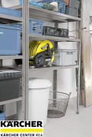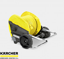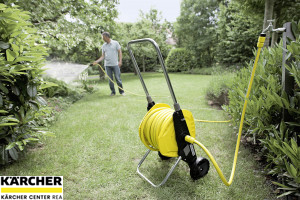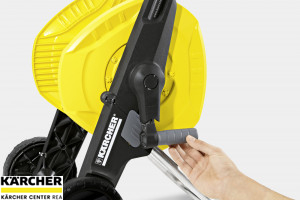 Hadicový vozík s výškově nastavitelnou rukojetí, zalomenou připojovací vsuvkou, volnoběžnou ruční klikou a inovativní funkcí sklápění k prostorově úsporné úschově. Kompletně smontovaný.