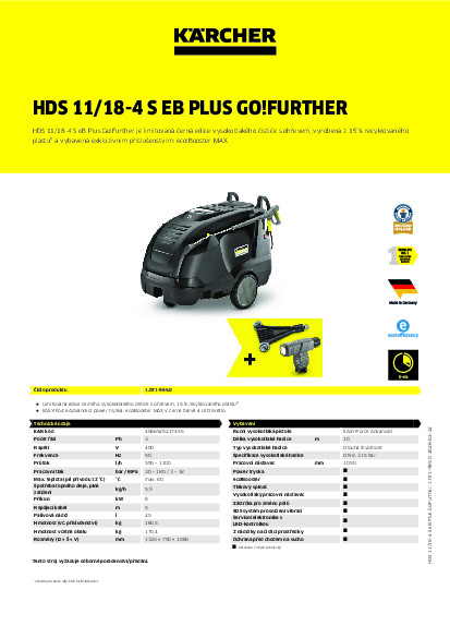 Limitovaná edice černého modelu HDS 11/18-4 S eB Plus Go!Further, vyrobená z téměř 15 % recyklovaného plastu¹⁾ a vybavená exkluzivním příslušenstvím, jako je eco!Booster MAX a LED osvětlení trysky, je ekologickým a výkonným zařízením třídy v super třídě vysokotlakých čističů s ohřevem vody. Režim eco!efficiency, přesná dávkovací jednotka čisticího prostředku, servisní spínač pro regulaci tvrdosti vody a optimalizovaná konstrukce hořáku umožňují ekonomický provoz a zároveň poskytují vynikající výsledky čištění. To je dáno zejména vynikající účinností čerpadla, patentovanou technologií trysky, keramickými písty a turbodmychadlem. Intuitivní ovládání s LED displeji usnadňuje používání, zatímco dvě otočná kolečka, velká kola s gumovými pneumatikami a ergonomické rukojeti zajišťují snadnou přepravu. Údržba a servis jsou také snadné: všechny důležité komponenty jsou snadno přístupné a důležité provozní údaje lze pohodlně vyhledat.