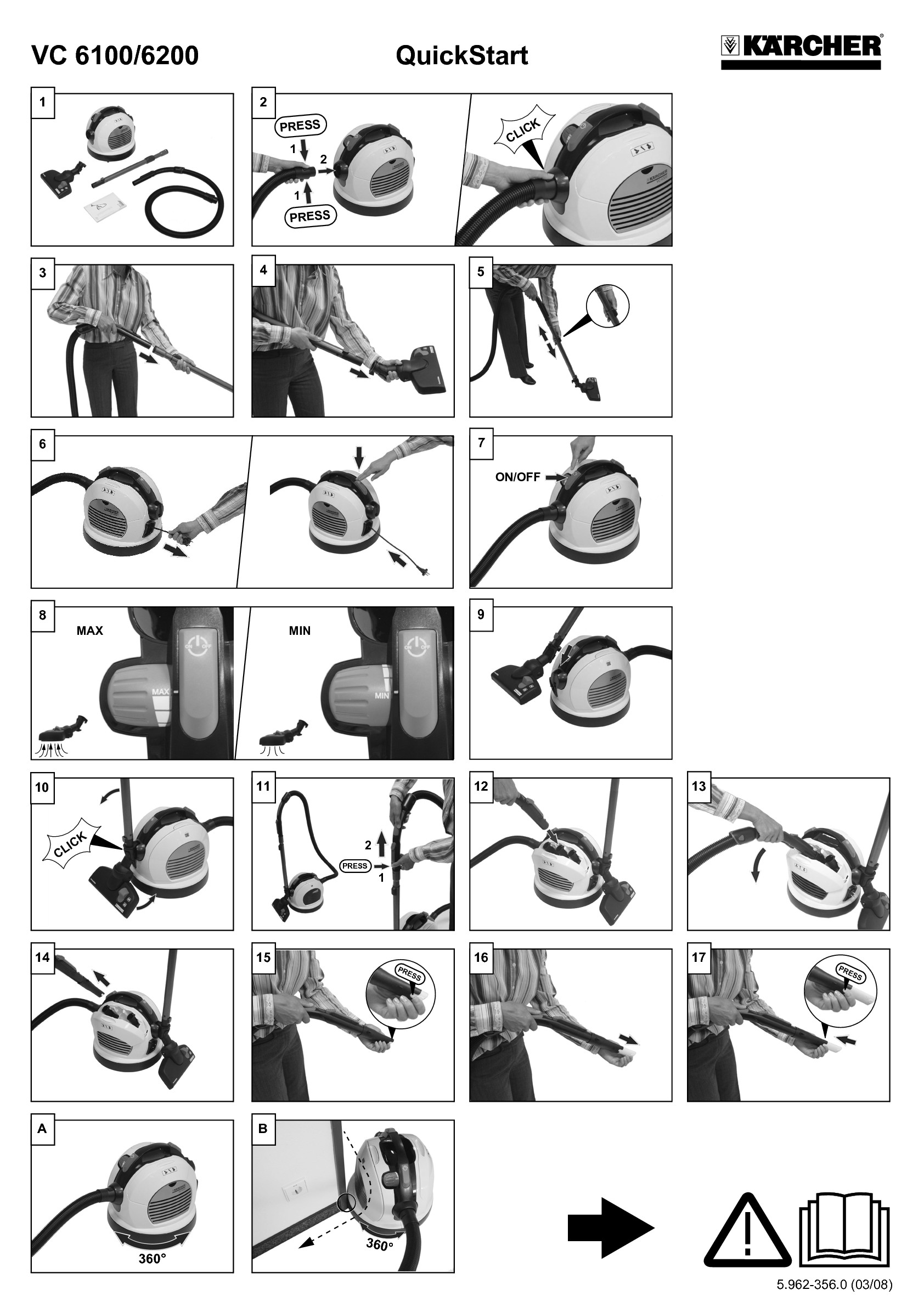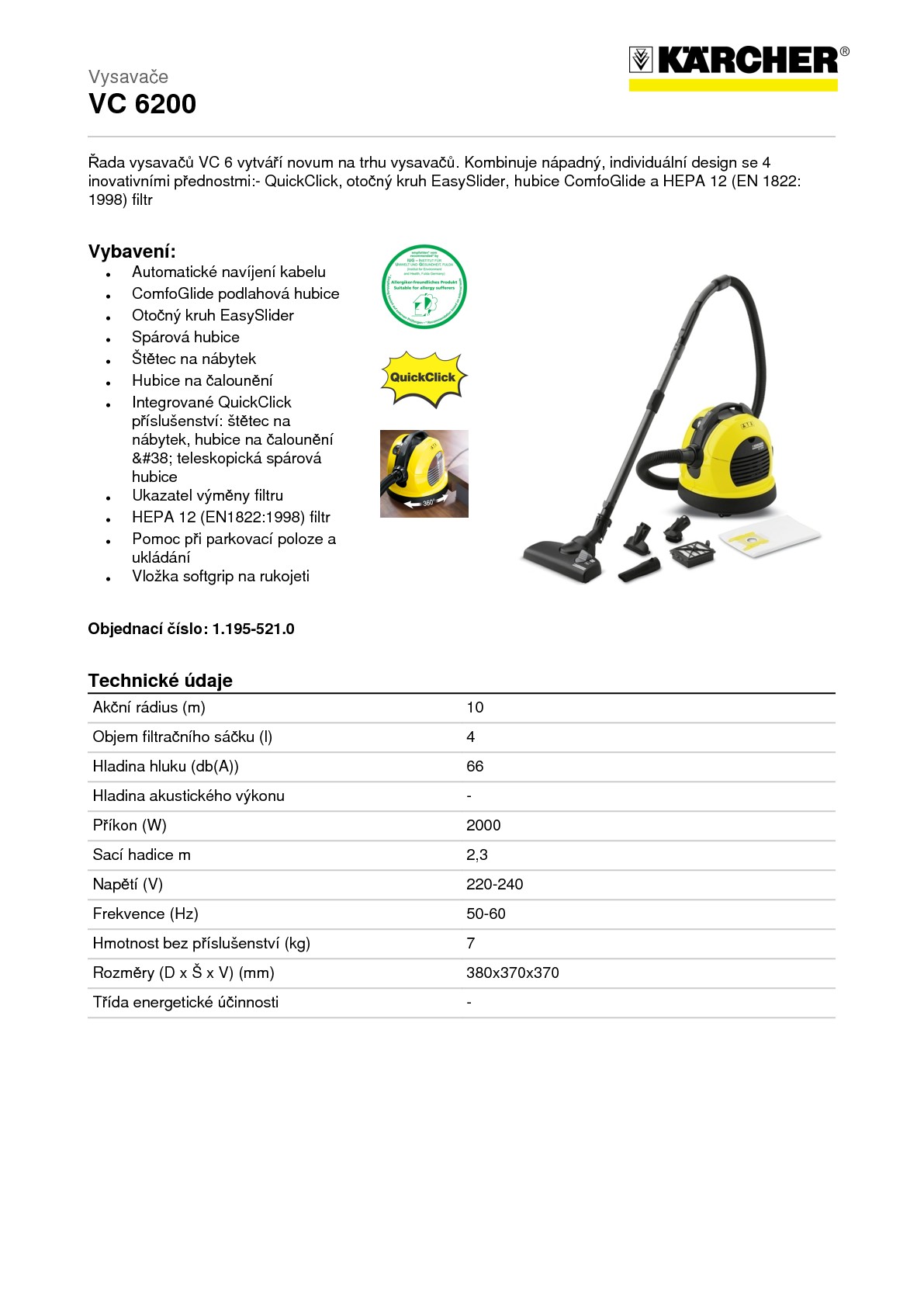 Vysavač Kärcher VC 6200 je velice kvalitním a chytrým pomocníkem. Novinkou je systém QuicClick, který umožňuje výměnu jednotlivých nástavců zcela bezdotykově. Otevře se přihrádka na příslušenství, zacvakne se zvolené příslušenství a vytáhne se ven. V případě výměny se zasune zpět, vycvakne a zacvakne jiné. EasySlider systém umožňuje otáčení vysavače o 360° aniž by se s ním pohybovalo. Kolečka jsou umístěná pod podvozkem, který je od zbytku vysavače oddělen o 360° otočnou částí. Vysavač stojí ve středu místnosti, vy se pohybujete kolem něj a on se otáčí za Vámi. Žádné poskakování, žádné zamotávání se do kabelu. Hubice ComfoGlide je vybavena speciálně posazenými kolečky, které umožňují při práci aktivní naklepávání koberce a zkvalitňují a zrychlují tak vysávání. Filtr HEPA 12 zajišťuje nejkvalitnější filtraci pro Váš čistý vzduch při vysávání.
