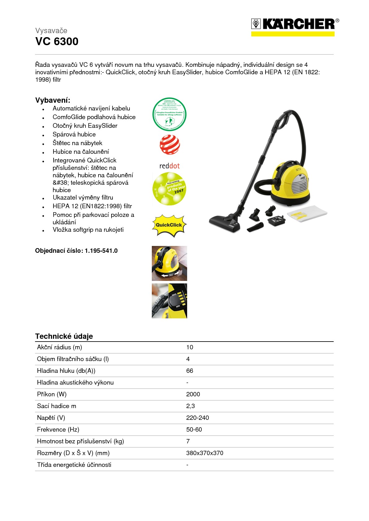 Vysavač Kärcher VC 6300 je velice kvalitním a chytrým pomocníkem. Novinkou je systém QuicClick, který umožňuje výměnu jednotlivých nástavců zcela bezdotykově. Otevře se přihrádka na příslušenství, zacvakne se zvolené příslušenství a vytáhne se ven. V případě výměny se zasune zpět, vycvakne a zacvakne jiné. EasySlider systém umožňuje otáčení vysavače o 360° aniž by se s ním pohybovalo. Kolečka jsou umístěná pod podvozkem, který je od zbytku vysavače oddělen o 360° otočnou částí. Vysavač stojí ve středu místnosti, vy se pohybujete kolem něj a on se otáčí za Vámi. Žádné poskakování, žádné zamotávání se do kabelu. Hubice ComfoGlide je vybavena speciálně posazenými kolečky, které umožňují při práci aktivní naklepávání koberce a zkvalitňují a zrychlují tak vysávání. Filtr HEPA 12 zajišťuje nejkvalitnější filtraci pro Váš čistý vzduch při vysávání.