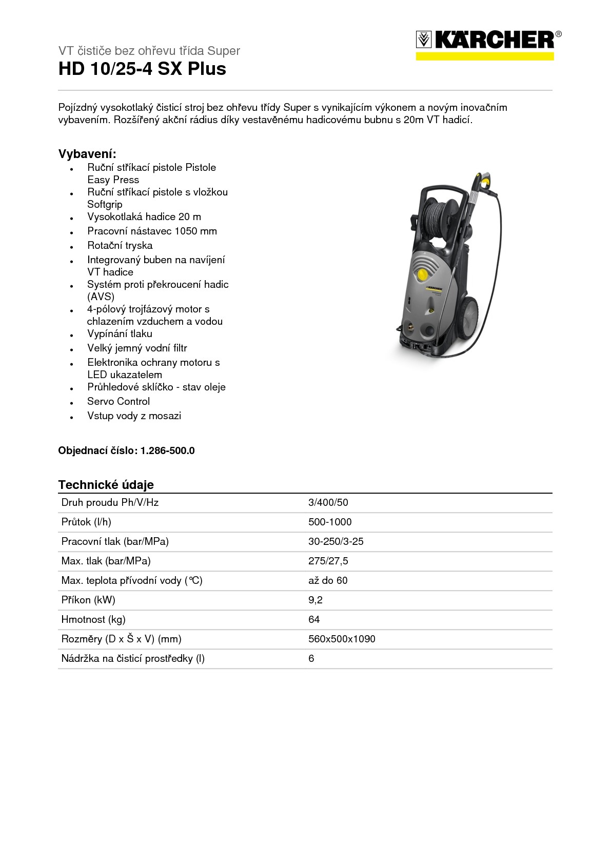 Nový mobilní vysokotlaký čistič KÄRCHER HD 10/25-4 SX Plus třídy Super s vynikajícím výkonem a novým inovačním vybavením. Oproti modelu HD 10/25 S plus je navíc vybaven o 10 m delší vysokotlakou hadicí a navíjecím bubnem. Vysoce výkonný vysokotlaký stroj nejvyšší kategorie. Médiem nového třipístého čerpadla, poháněného excentrickým diskem, je třífázový, pomaloběžný, 4-pólový elektromotor s napájecím napětím 400 V. Co se pracovního tlaku týče, je se svým maximálním výkonem 250 bar nejsilnějším mezi klasickými vysokotlakými čistícími stroji. Stroj disponuje integrovaným tankem na čistící přípravek s regulátorem přisávaného množství.