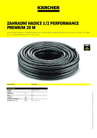 Hadice Performance Premium 1/2" firmy Kärcher není běžnou zahradní hadicí. Je vyrobena z inovativní tkaniny technologií Kärcher Premium Anti-Torsion, díky které nabízí nejvyšší míru robustnosti, pružnosti a odolnosti proti zlomení. Tím hadice zaručuje neustálý průtok vody při zavlažování menších až středně velkých ploch a zahrad. Kromě toho chrání vnější anti UV vrstva materiál, mezivrstva nepropouštějící světlo zabraňuje tvorbě řas v hadici. Hadice Performance Premium o délce 20 metrů přesvědčí i v otázkách zdraví a trvalosti, jelikož neobsahuje ftaláty (< 0,1 %), kadmium, barium ani olovo. Mezi další přednosti patří tlak 45 bar a vysoká odolnost proti teplotním výkyvům od −20 do +60 °C.