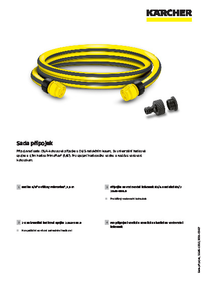 Připojovací sada pro propojení hadicového vozíku a nosiče s vodovodním kohoutkem. Sada se skládá z přípojky ke kohoutu G3/4 s redukcí G1/2, 2 univerzálních hadicových spojek a 1,5 m dlouhé hadice PrimoFlex® (5/8"). Zahradní hadice Kärcher ze zavlažovací řady jsou velmi flexibilní, robustní a odolné proti zlomení. Výhody máte jako na dlani: dlouhá životnost a jednoduchá manipulace. Zavlažování s Kärcherem je chytré zavlažování.