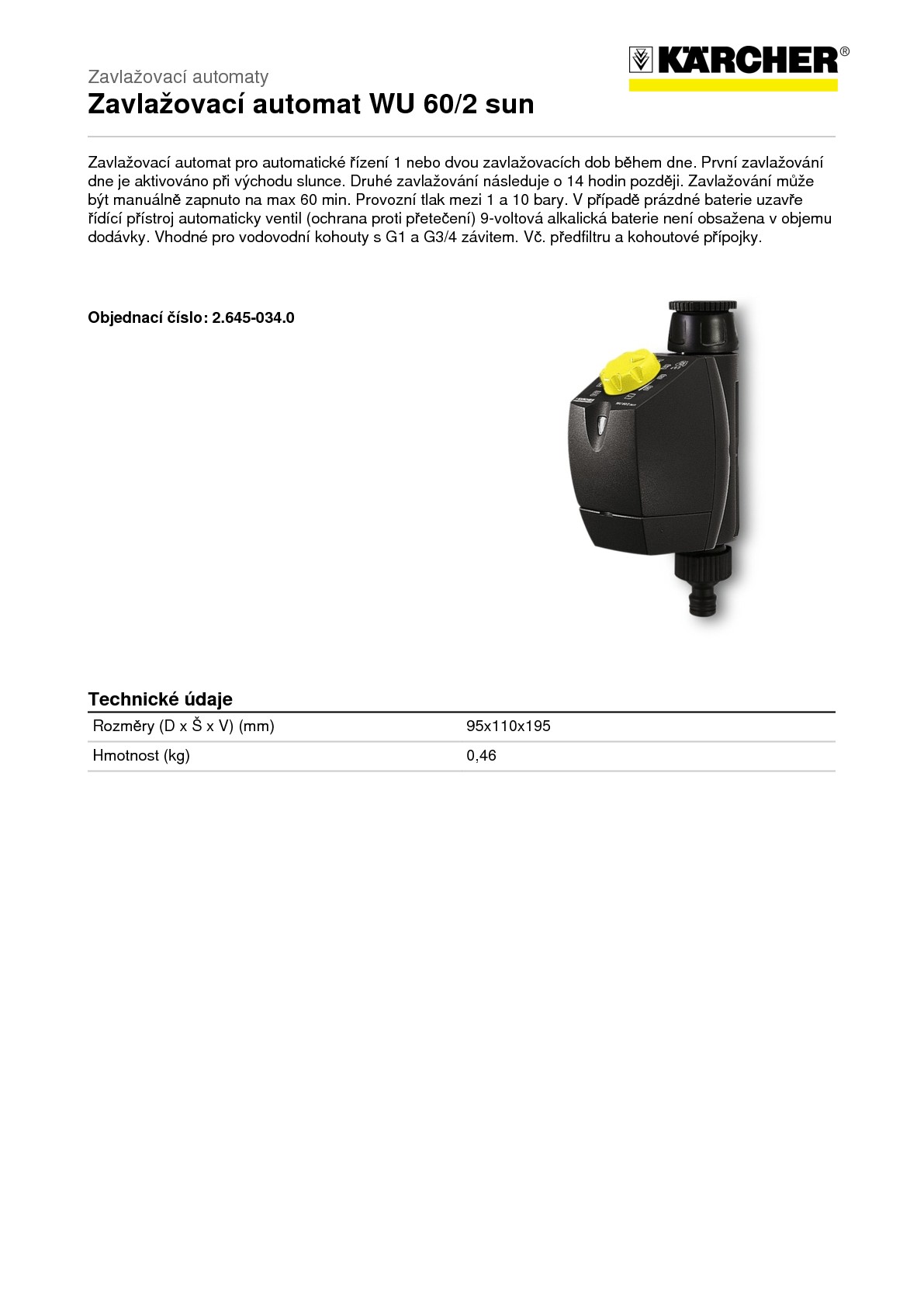 Kärcher Zavlažovací automat WU 60/2 sun - Zavlažovací automat pro automatické řízení 1 nebo dvou zavlažovacích dob během dne. První zavlažování dne je aktivováno při východu slunce.